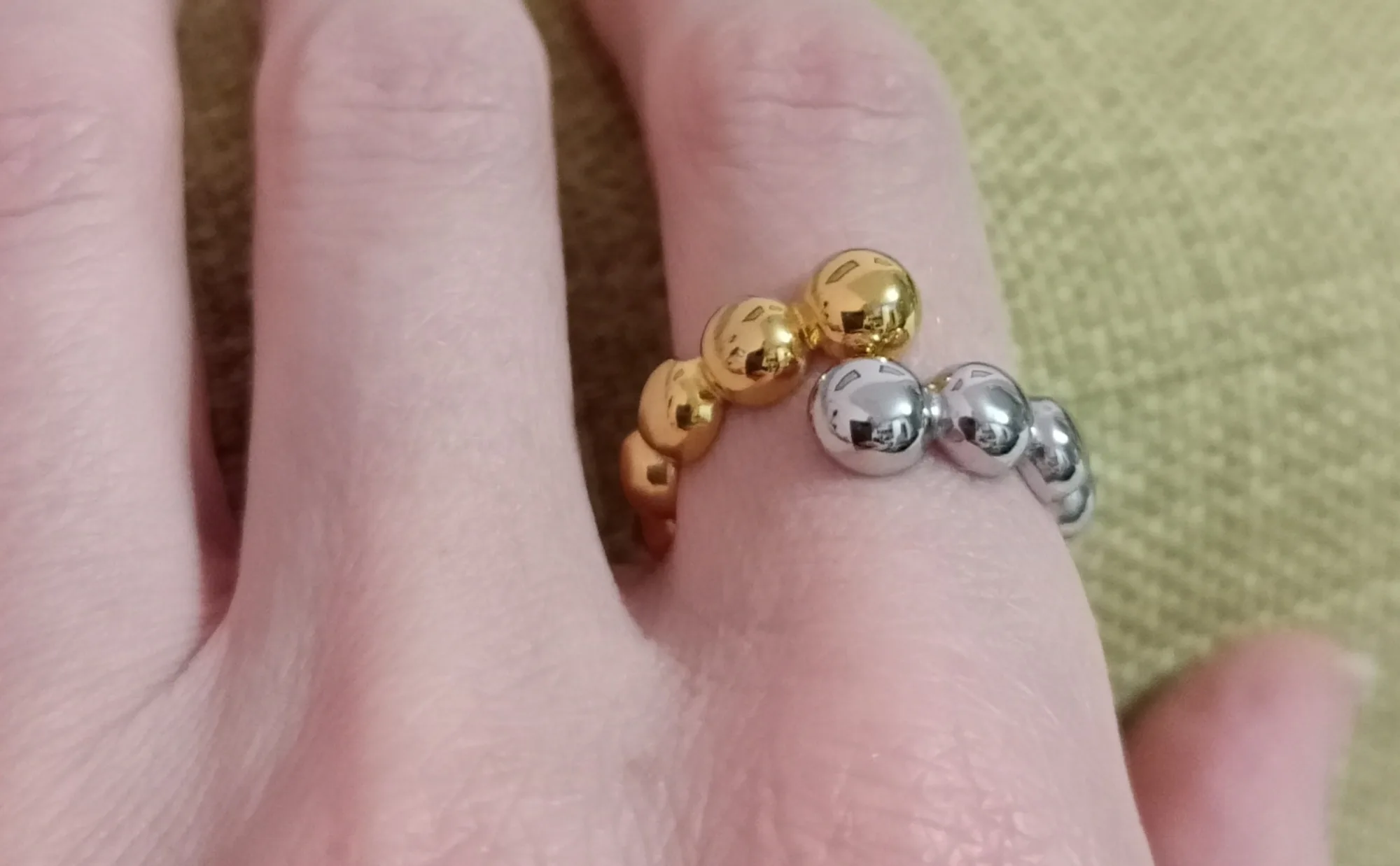 Moderner Minimalismus trifft auf verspieltes Design in diesem zweifarbigen Perlenring. Das verstellbare, offene Band aus robustem Edelstahl ist mit polierten Kugelperlen in kontrastierenden Gold- und Silbertönen besetzt, die eine faszinierende optische Balance erzeugen. Das skulpturale Perlendesign schmiegt sich elegant um Ihren Finger und bietet sowohl zeitgemäßen Stil als auch hohen Tragekomfort.